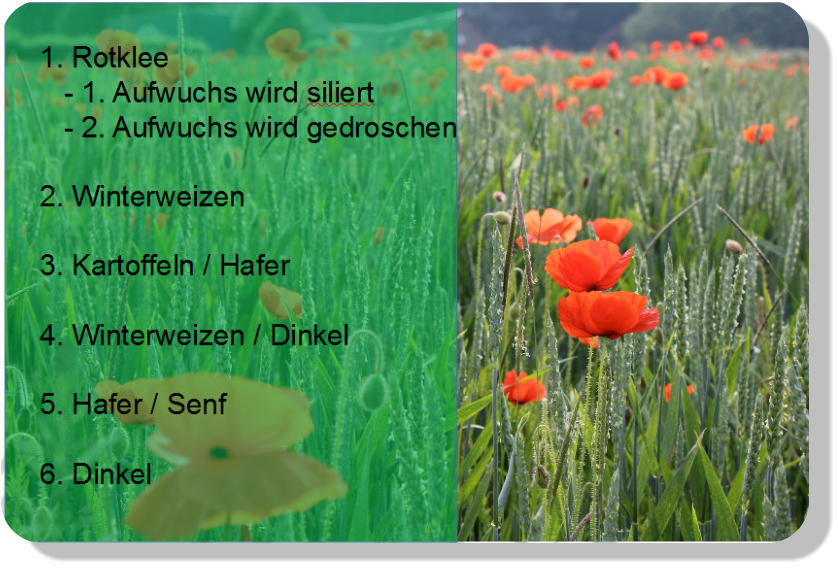 Die Kornkammer hat eine weite Fruchtfolge die sich erst nach 6 Jahren wiederholt. Dadurch wird eine nachhaltige und gesunde Bodenfruchtbarkeit garantiert.
